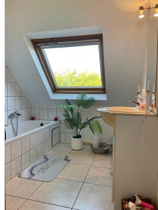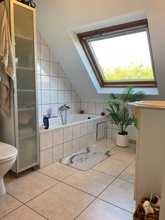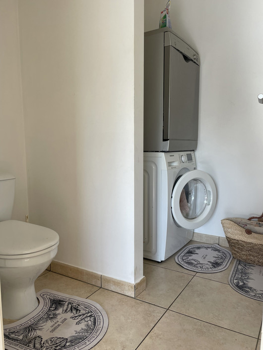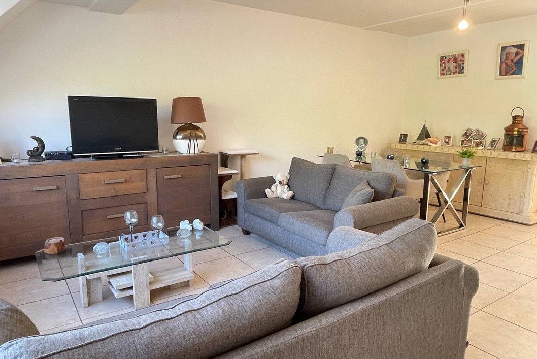 De eerste verdieping van het appartement verwelkomt u met een ruime leefruimte en een open, volledig geïnstalleerde keuken. Aansluitend bevindt zich een ruime berging, een kleinere opbergruimte en een apart gastentoilet met extra opbergmogelijkheden. Vanuit de keuken heeft u toegang tot een gezellig terras. Op de bovenverdieping bevinden zich twee slaapkamers en een badkamer uitgerust met een ligbad, enkele wastafel en een tweede toilet.