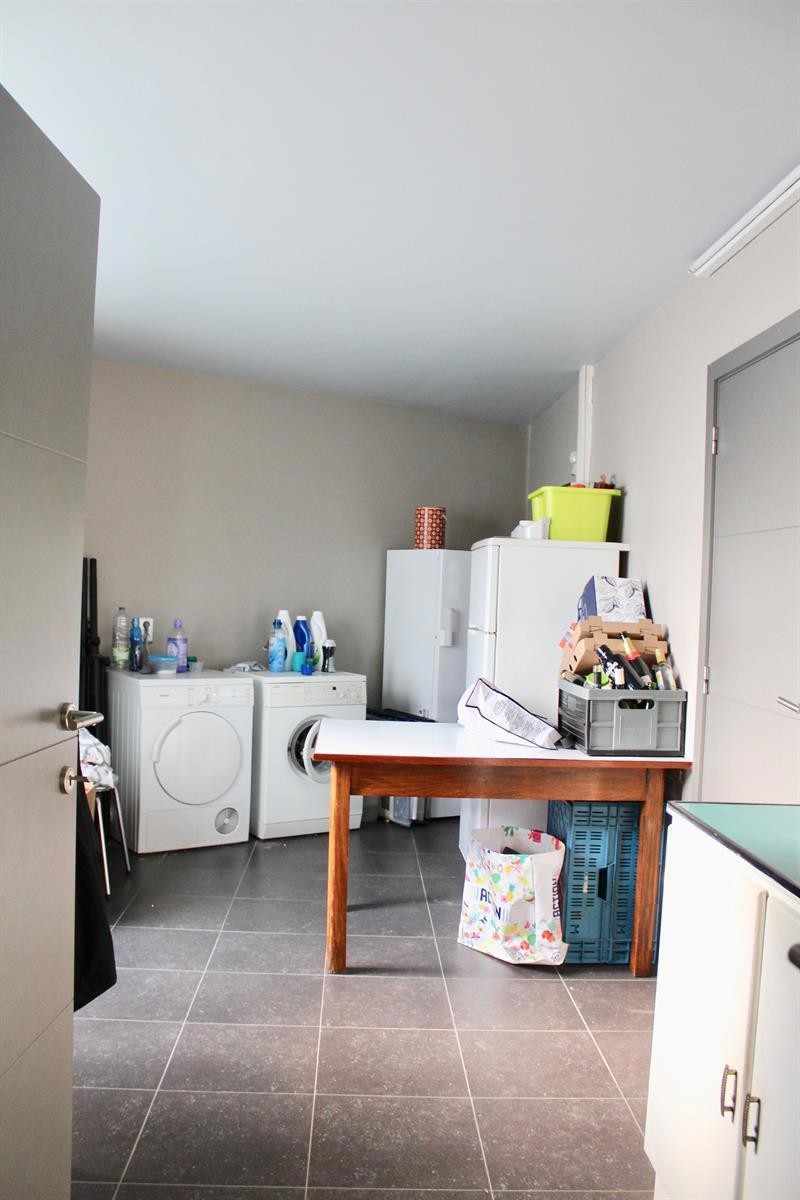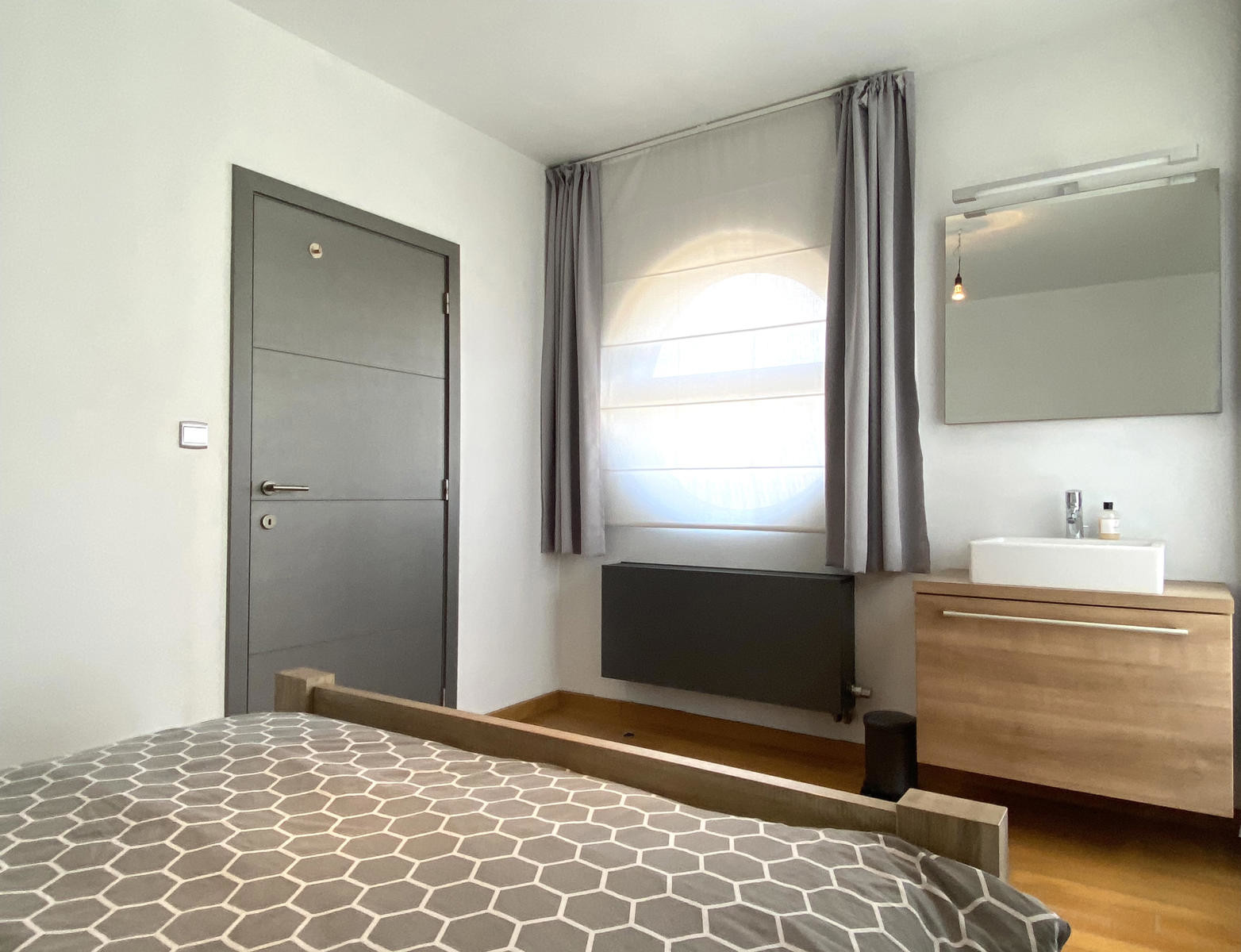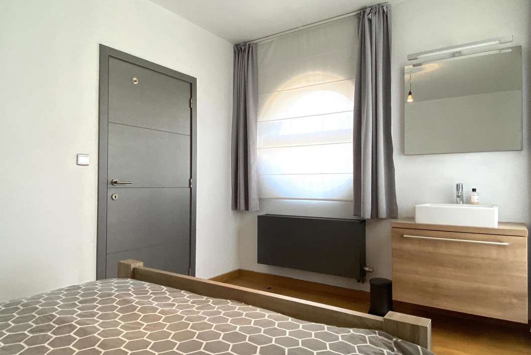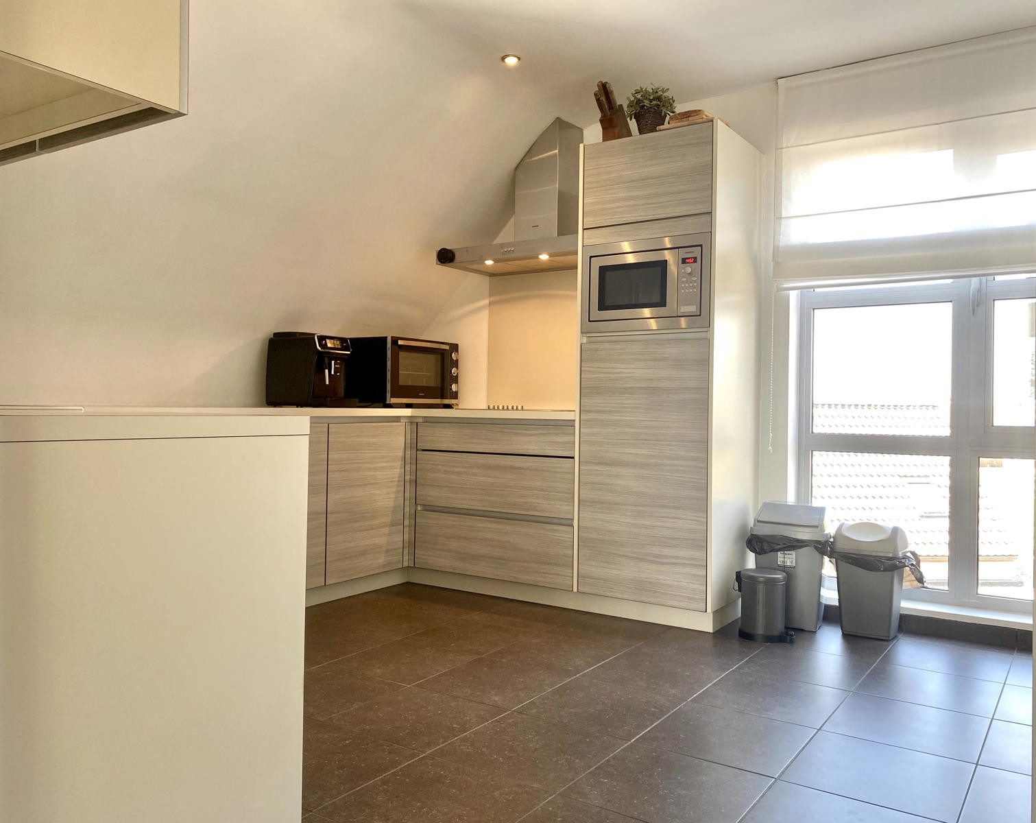 De indeling omvat een inkomhal, een lichtrijke leefruimte met open, volledig uitgeruste keuken (oven, elektrische kookplaat, koelkast, spoelbak, dampkap en vaatwasser) en een gezellige werkhoek, ideaal voor thuiswerk. Er is één ruime slaapkamer en een tweede, kleinere kamer die perfect kan dienen als coole kinderkamer, aparte dressing of comfortabel bureel. De badkamer beschikt over een dubbele lavabo en een ligbad met douchefunctie; daarnaast is er een apart toilet aanwezig. Vanuit de leefruimte heb je toegang tot een knus tweepersoonsterras met een rustgevend uitzicht op het achterliggende groen. Verder is er een private berging in het appartement. Een privéparkeerplaats voor één wagen is inbegrepen, net als een mogelijkheid om fietsen te stallen.