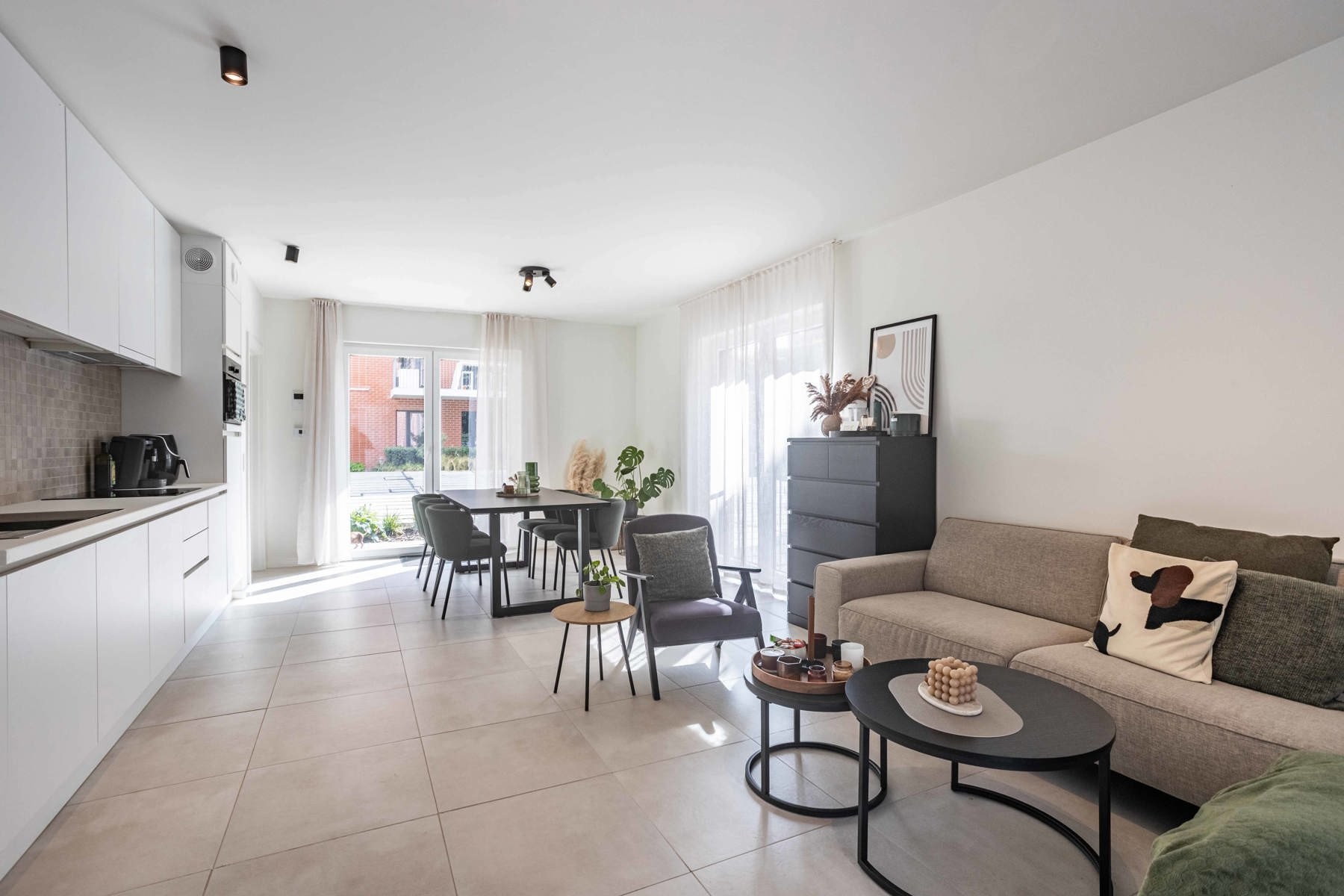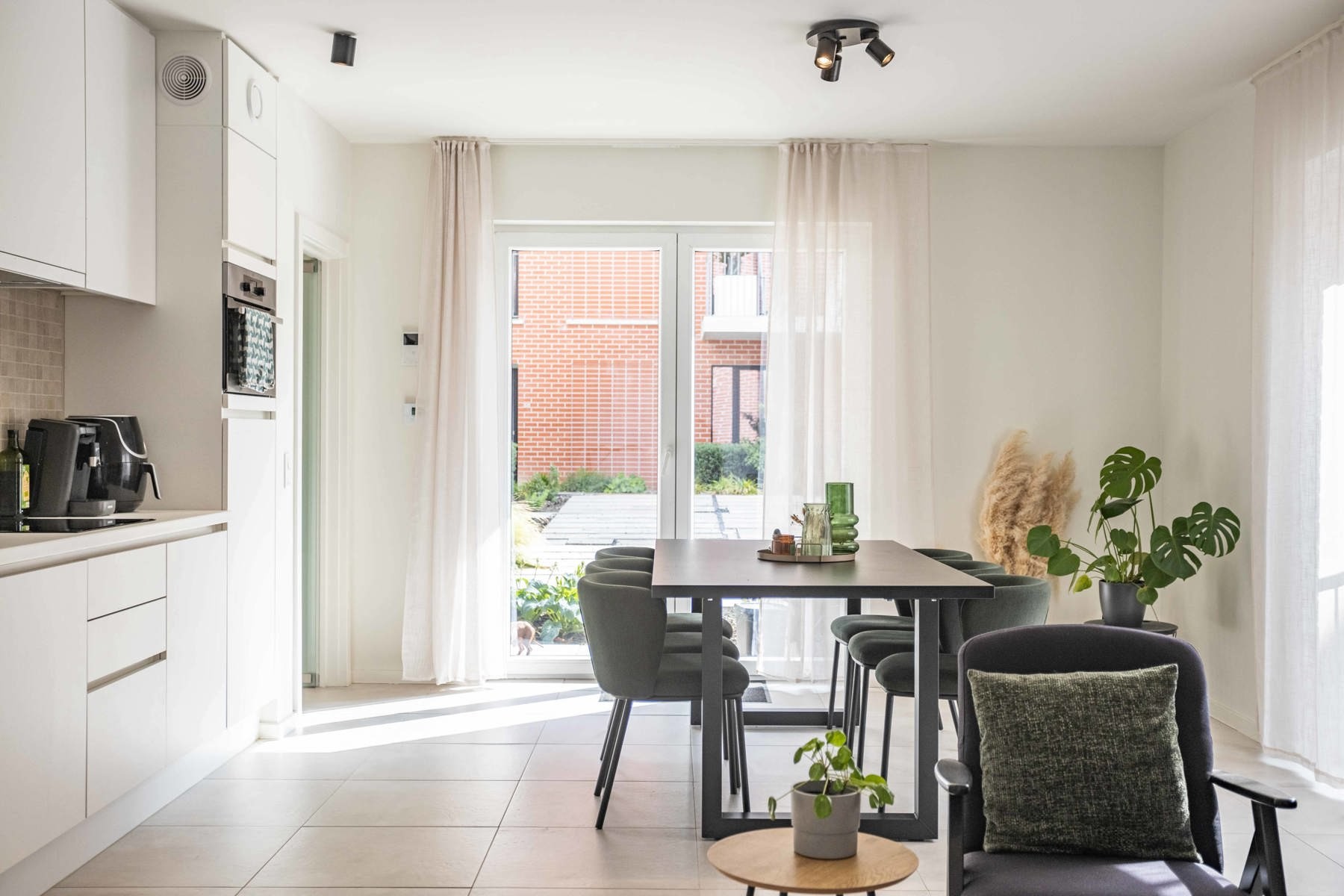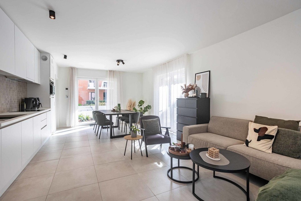 De indeling is praktisch en doordacht: je komt binnen via een inkomhal met apart gastentoilet, waarna je meteen doorloopt naar de gezellige leefruimte met open keuken. De keuken is volledig geïnstalleerd en voorzien van alle moderne toestellen.