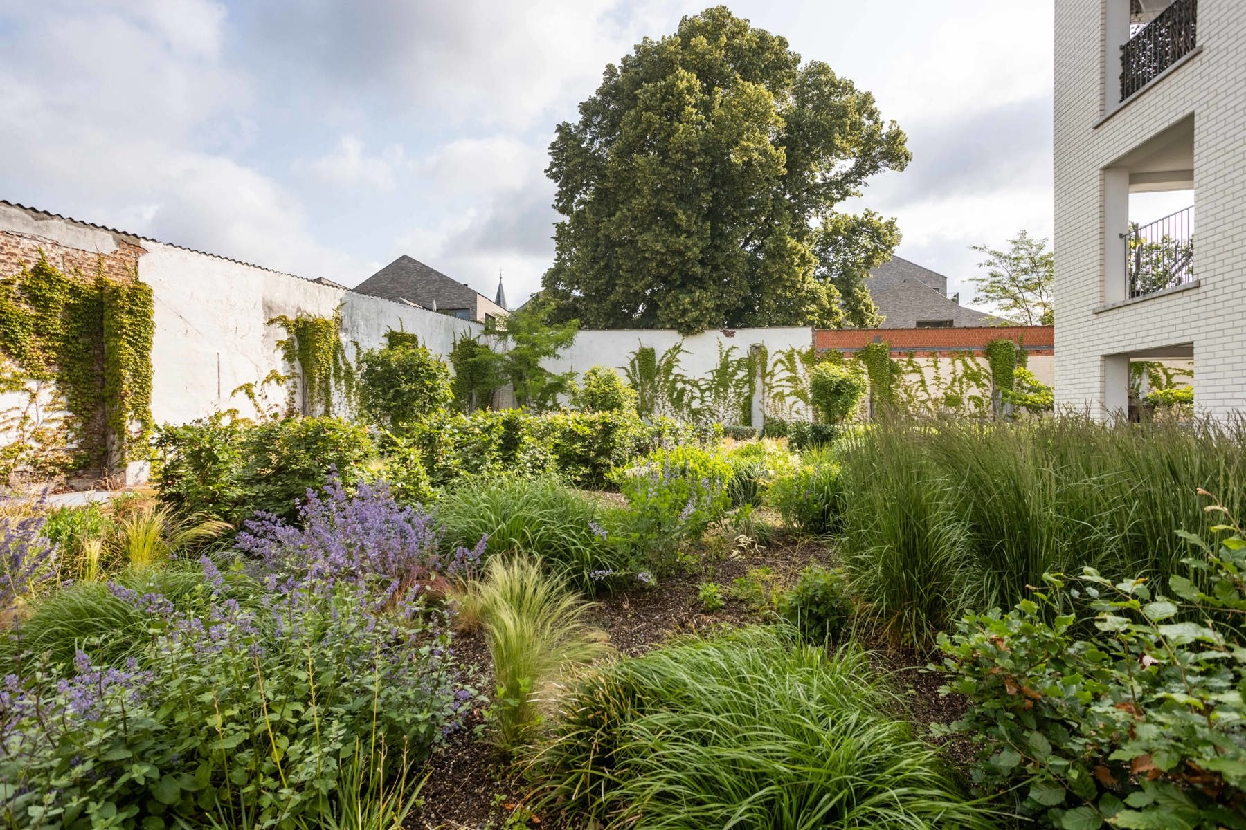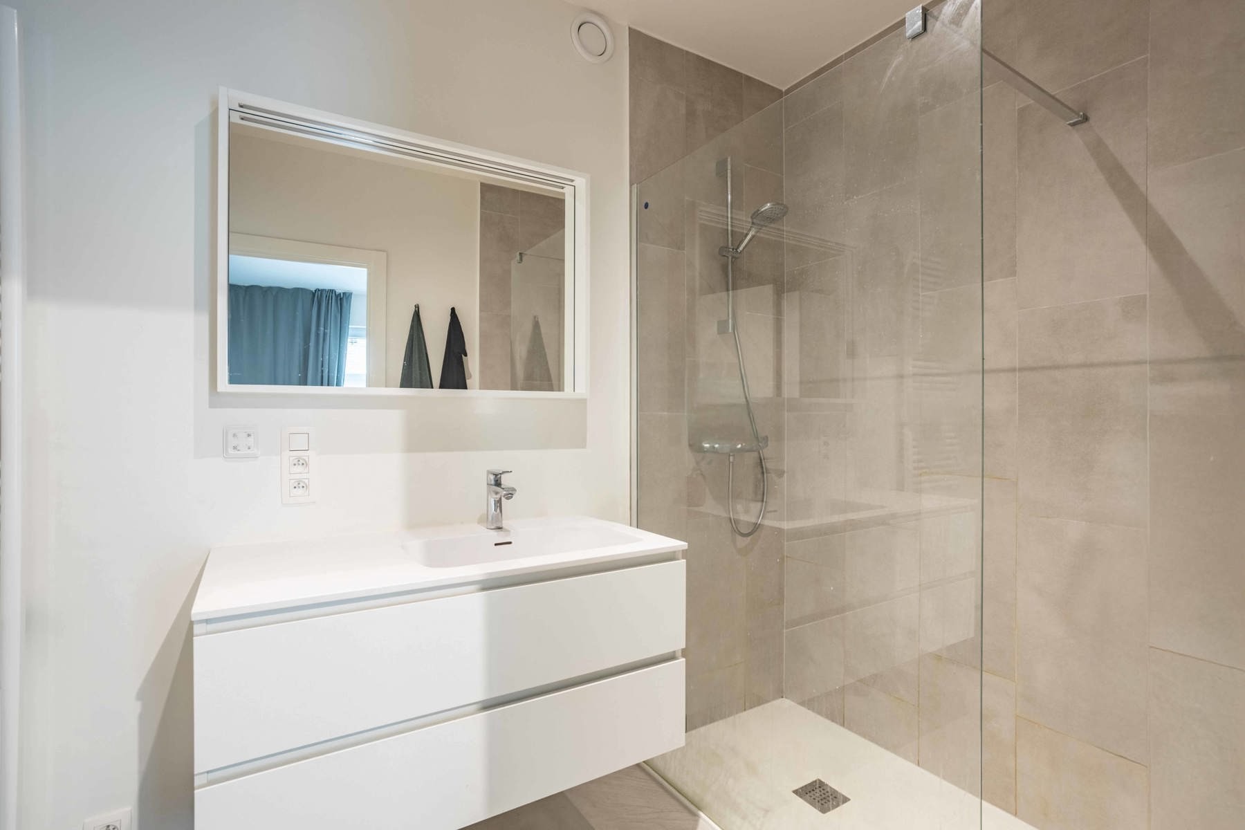 De ruime slaapkamer sluit aan op een stijlvolle badkamer met inloopdouche en enkele wastafel. Aan de rustige achterzijde van het gebouw vind je een aangenaam terras.