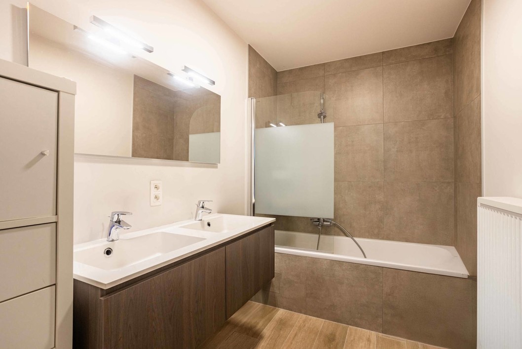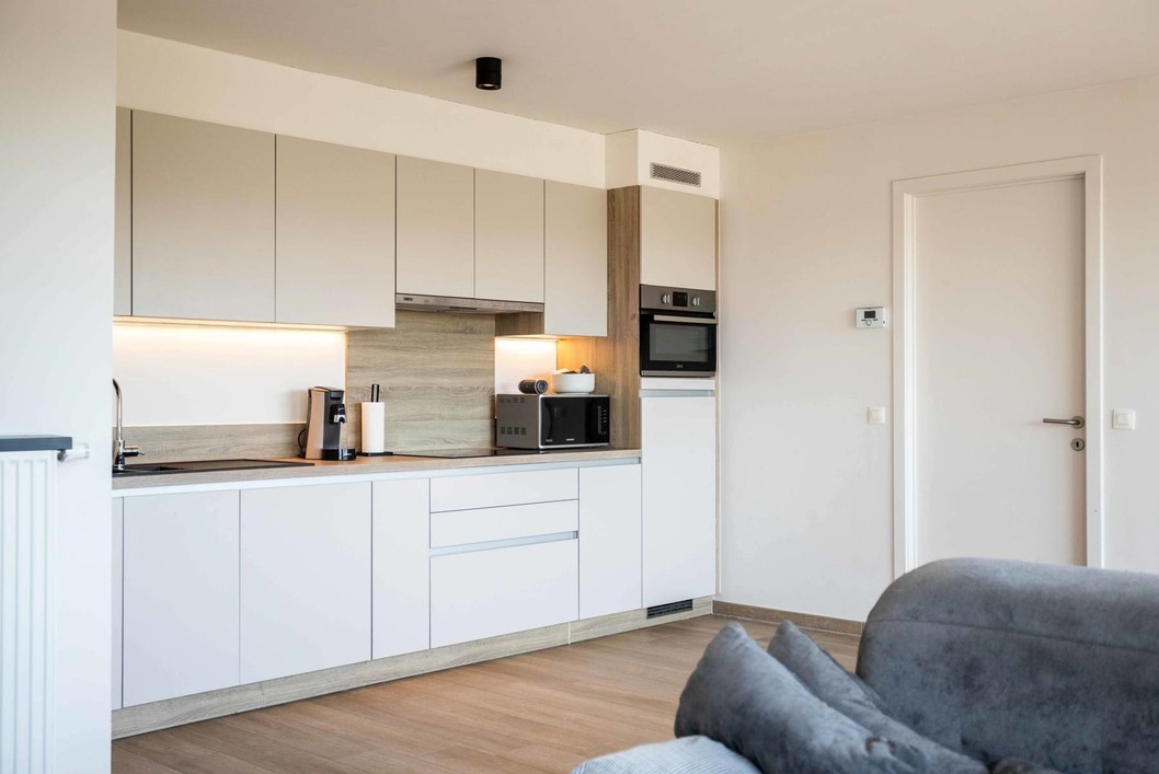 Bij het betreden van het appartement valt meteen de strakke indeling en de overvloed aan natuurlijk licht op. De inkomhal met gastentoilet leidt naar de ruime leefruimte met grote raampartijen die zorgen voor een aangename lichtinval. De open, volledig uitgeruste keuken sluit naadloos aan op de leefruimte en maakt dit de ideale plek om te koken én te genieten.