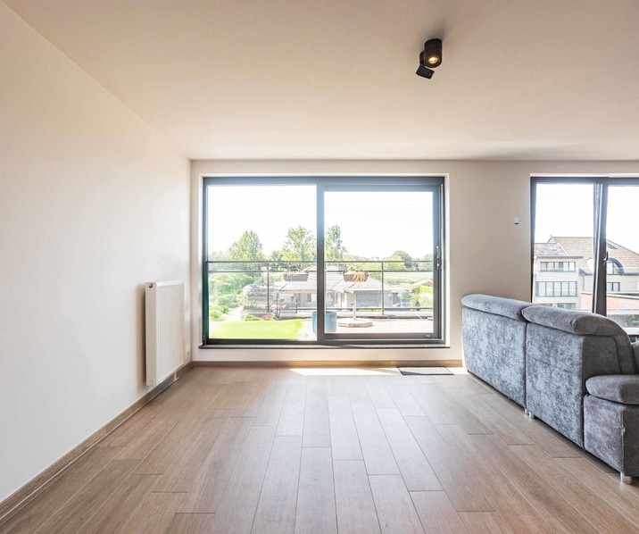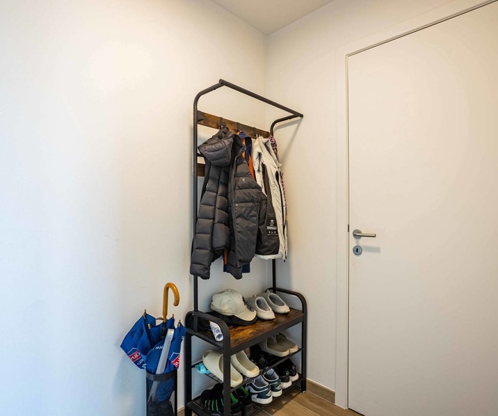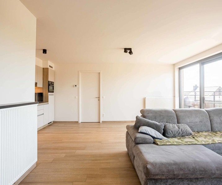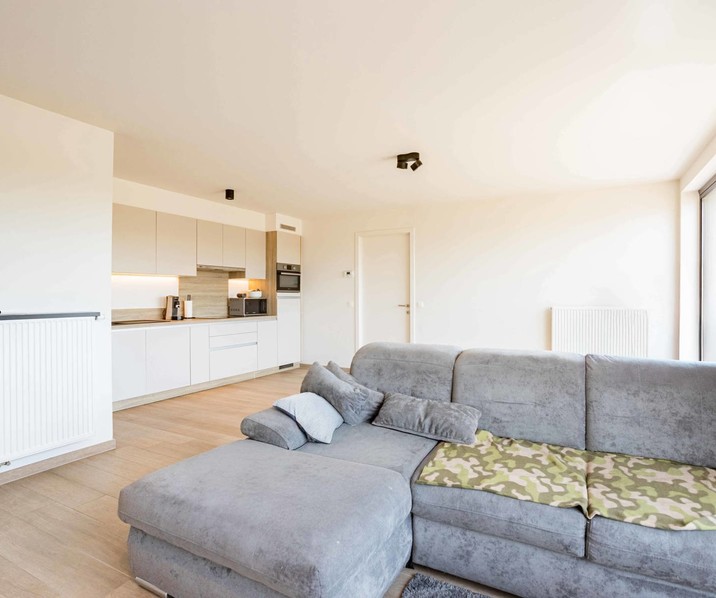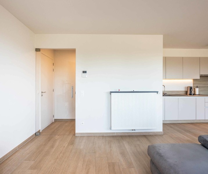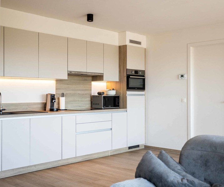 Bij het betreden van het appartement valt meteen de strakke indeling en de overvloed aan natuurlijk licht op. De inkomhal met gastentoilet leidt naar de ruime leefruimte met grote raampartijen die zorgen voor een aangename lichtinval. De open, volledig uitgeruste keuken sluit naadloos aan op de leefruimte en maakt dit de ideale plek om te koken én te genieten.