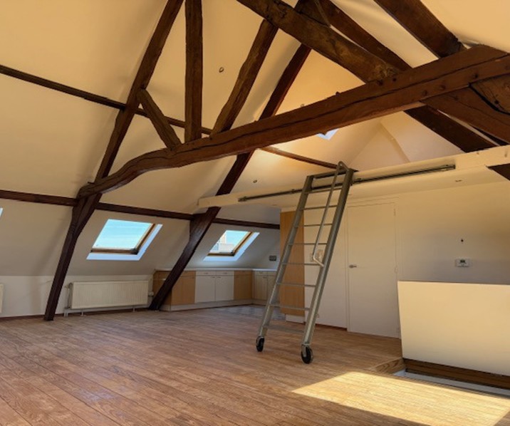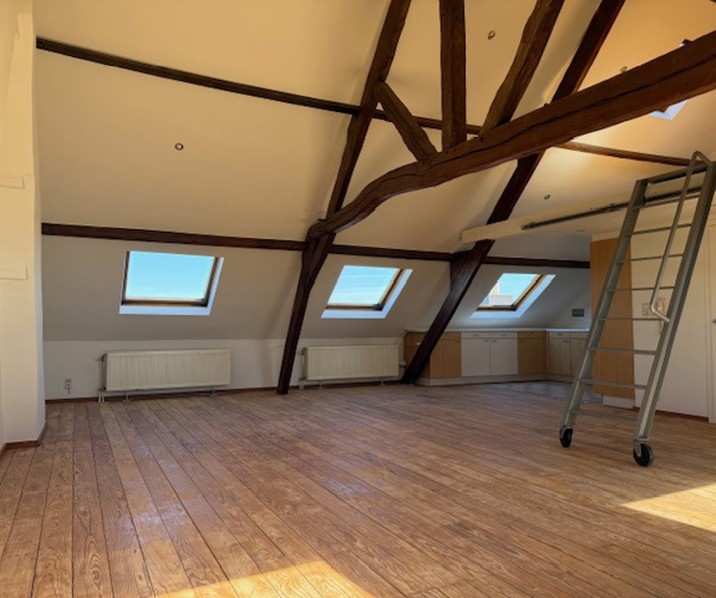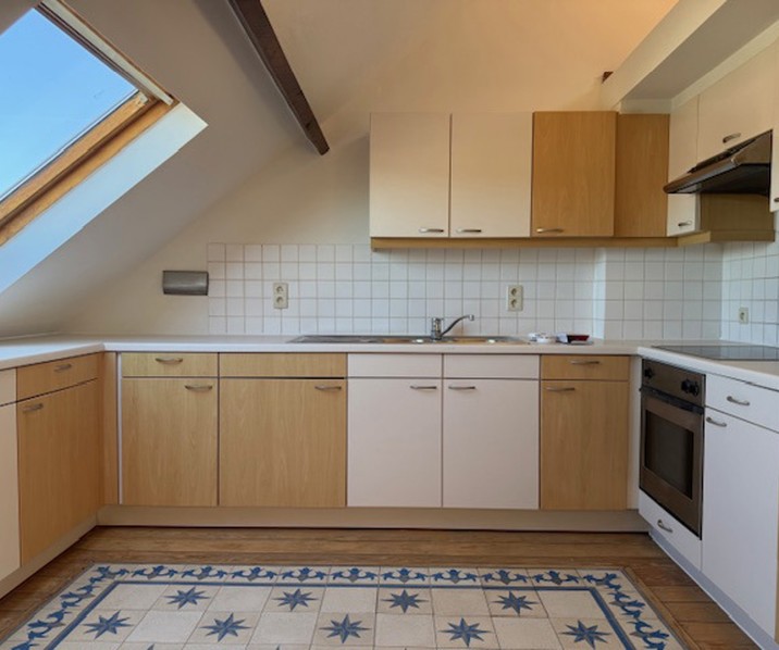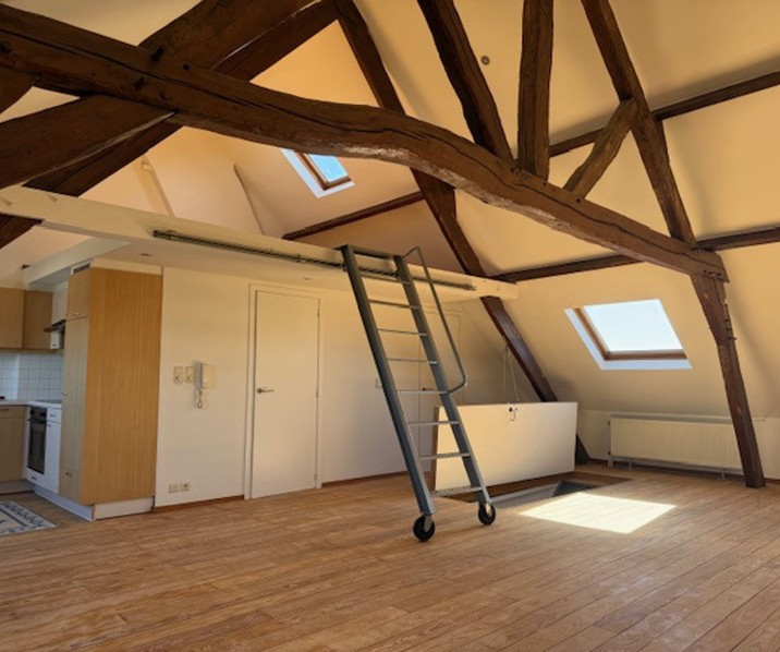 Dit volledig vernieuwde dakappartement bevindt zich op de 3e verdieping, zonder lift. Door de open inrichting krijg je een loftgevoel. De kamer op de mezzanine is te bereiken via een laddertrap in de woonkamer. Er is een geïnstalleerde keuken met frigo en oven aanwezig. In de badkamer, met ligbad en douchefunctie is er een wc en lavabo met kastjes. Een aparte berging met reeds geplaatste rekken is ook voorzien. Ideaal voor wie in de stad wilt wonen, vlakbij invalswegen en openbaar vervoer. Huurprijs is 825?.