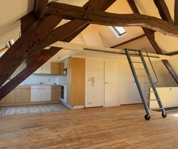 Dit volledig vernieuwde dakappartement bevindt zich op de 3e verdieping, zonder lift. Door de open inrichting krijg je een loftgevoel. De kamer op de mezzanine is te bereiken via een laddertrap in de woonkamer. Er is een geïnstalleerde keuken met frigo en oven aanwezig. In de badkamer, met ligbad en douchefunctie is er een wc en lavabo met kastjes. Een aparte berging met reeds geplaatste rekken is ook voorzien. Ideaal voor wie in de stad wilt wonen, vlakbij invalswegen en openbaar vervoer. Huurprijs is 800?.