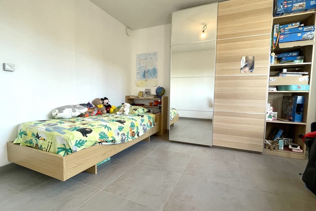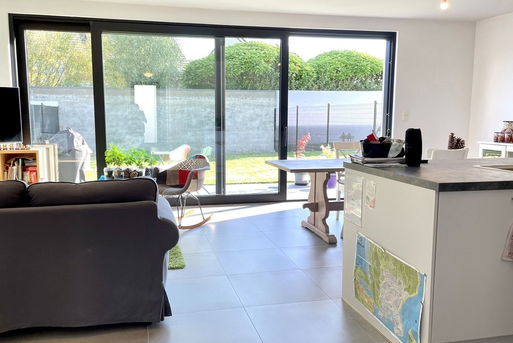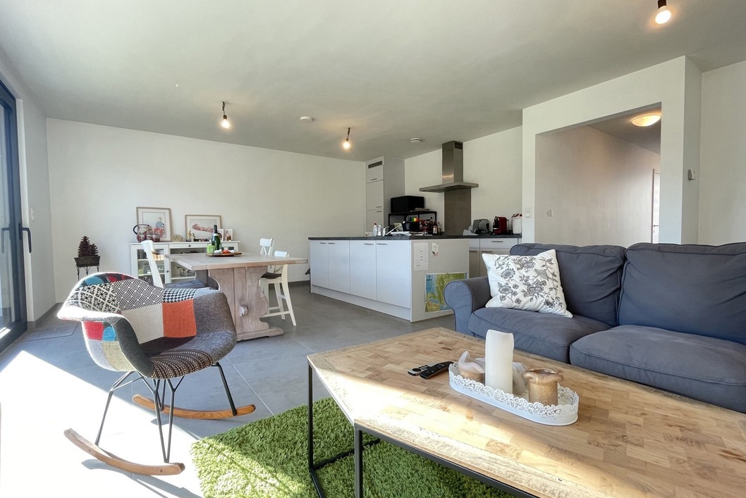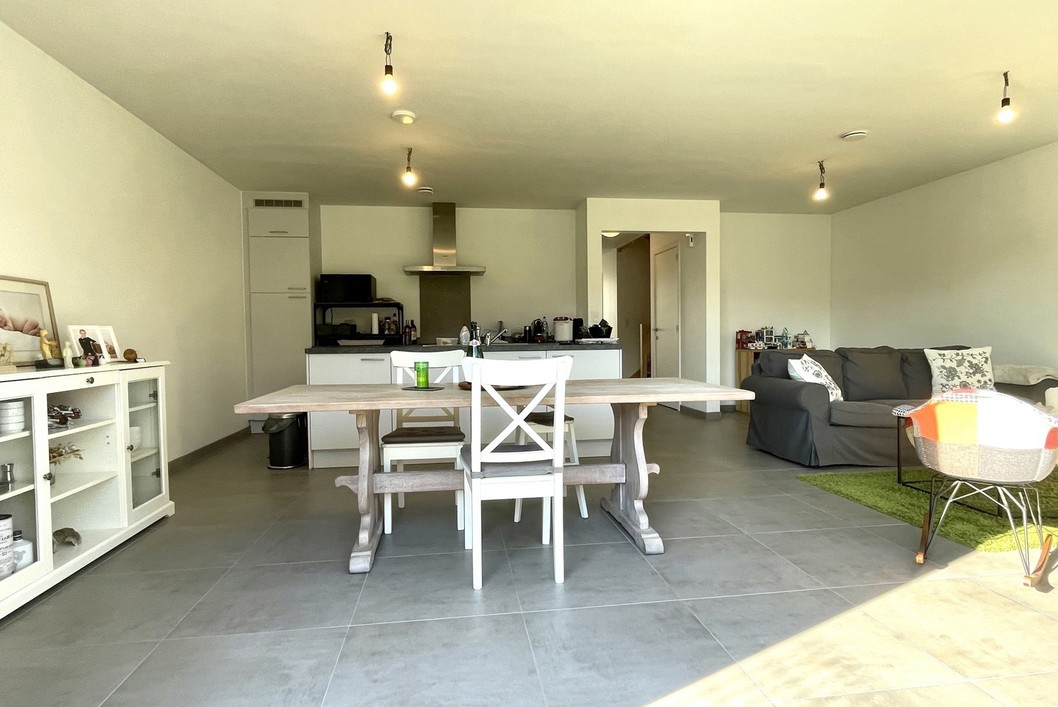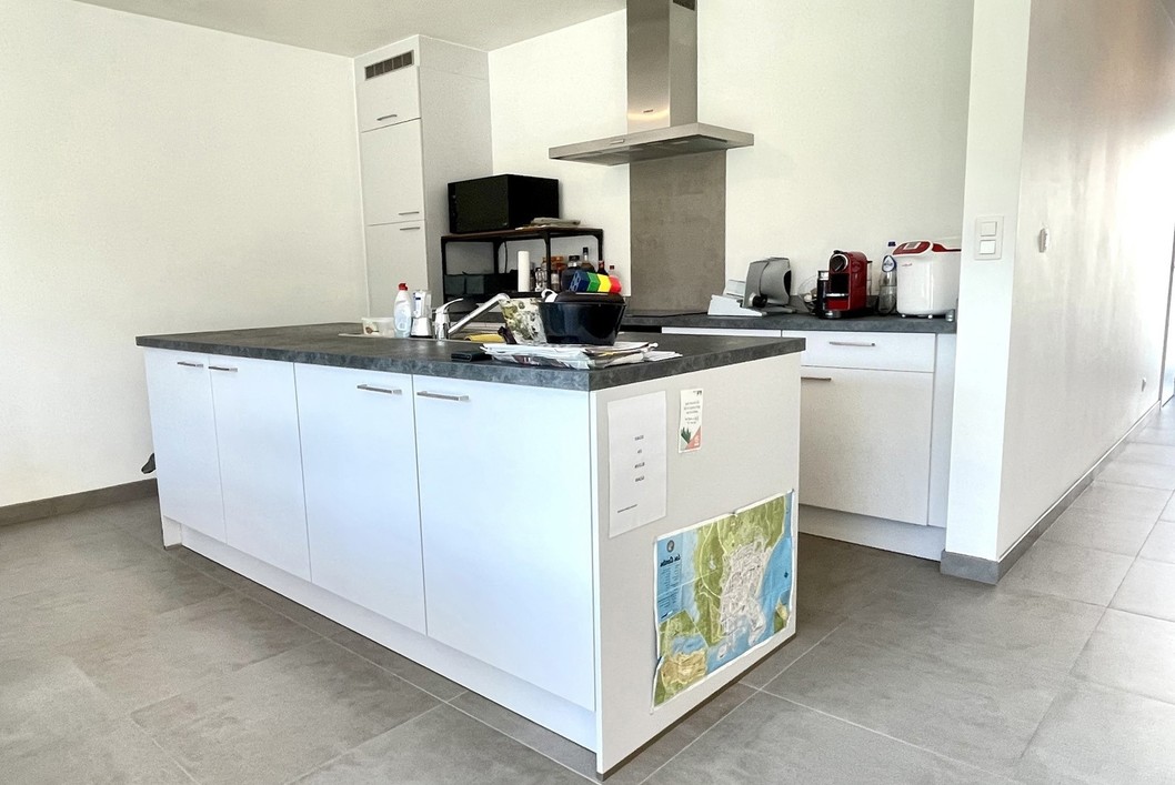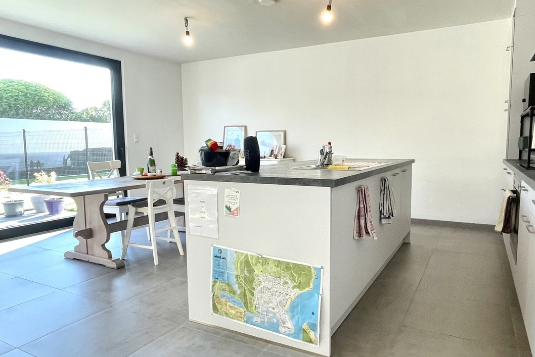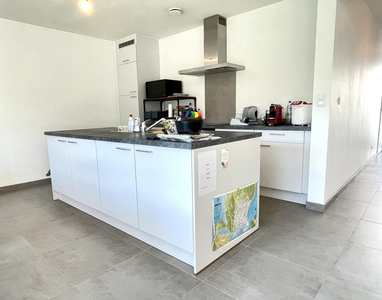 Deze BEN bewoning te Aalst is centraal gelegen in een rustige straat. De woning bestaat op de gelijkvloerse verdieping uit een inkomhal met apart gastentoilet en toegang tot de inpandige garage. Vervolgens beschikt de woning over een ruime leefruimte met open geïnstalleerde keuken, uitgerust met Siemens toestellen (dampkap, dubbele spoelbak, kookplaat, oven, koelkast, vaatwasmachine) en aparte bergruimte. Via het schuifraam heeft men toegang tot het terras met stadstuin.