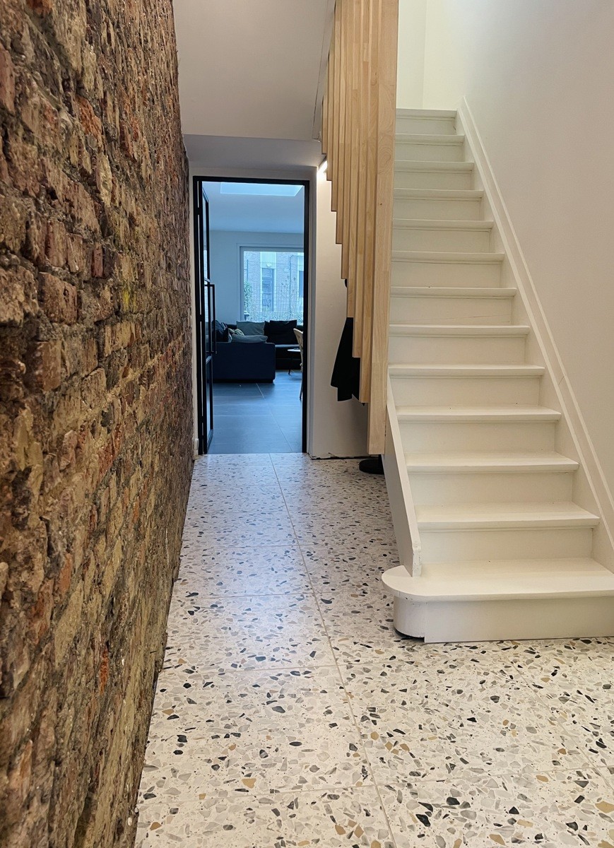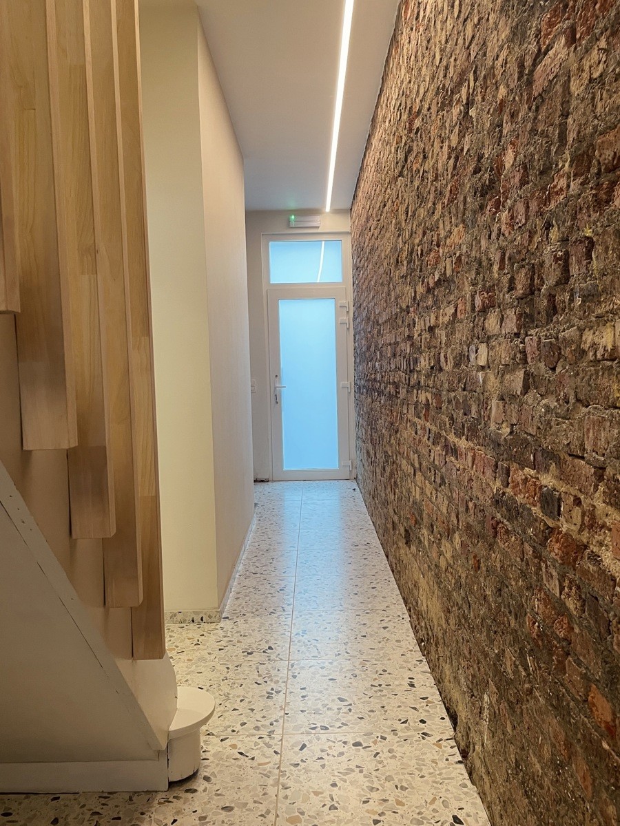 Deze volledig gerenoveerde woning met tuin is gelegen aan de stadsrand van Aalst, op korte afstand van de Grote Markt, scholen, winkels en openbaar vervoer. Bij het betreden van de woning komt u in de inkomhal die toegang geeft tot de lichtrijke leefruimte met een open, volledig geïnstalleerde keuken met aanpalende bergruimte en een mooi zicht op de tuin. Op het gelijkvloers bevinden zich daarnaast een praktische bureauruimte, die ook perfect kan dienen als kinderkamer, en een bergruimte.
