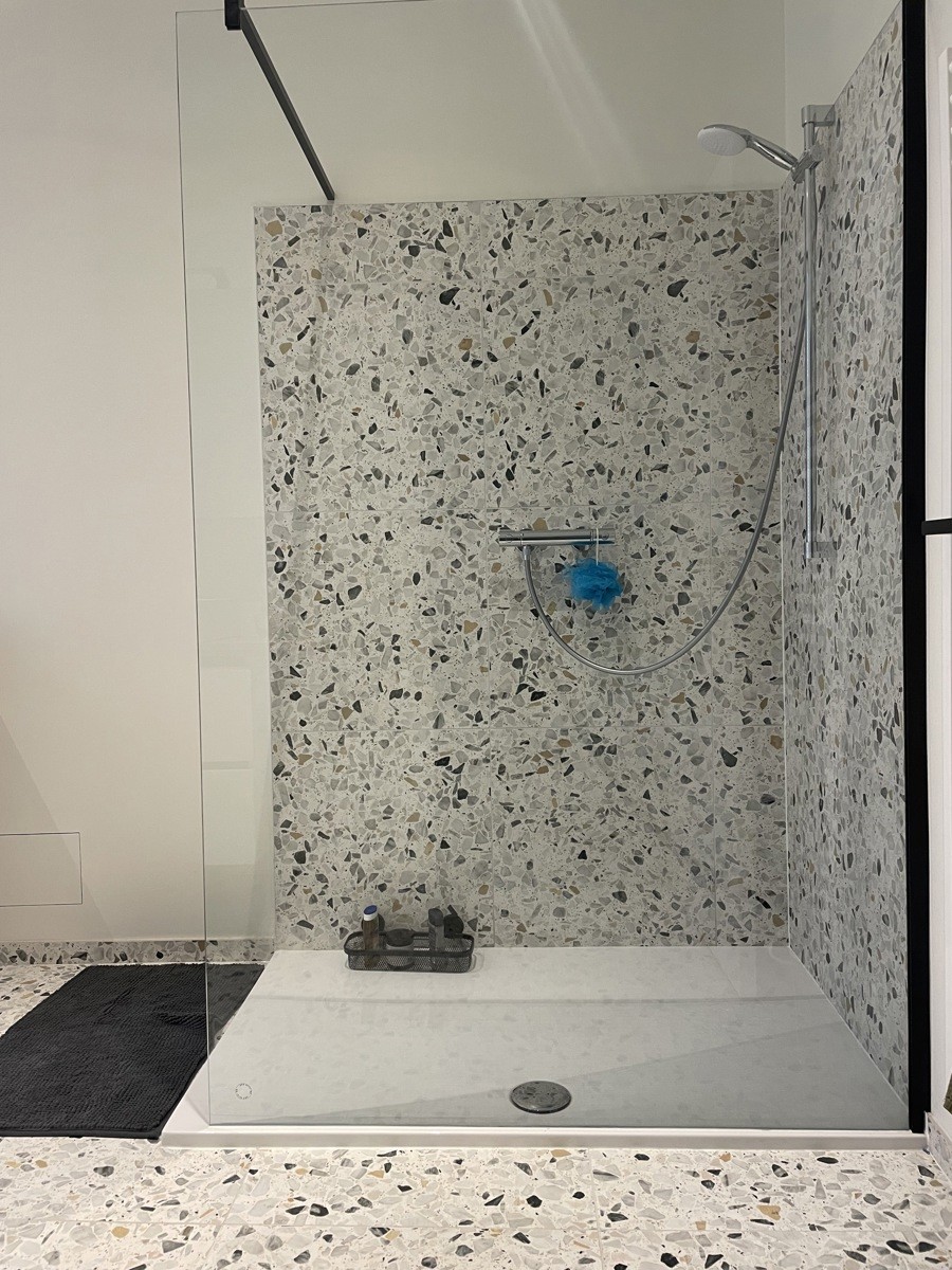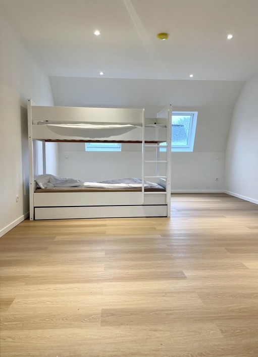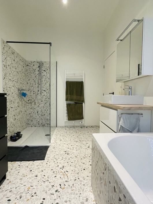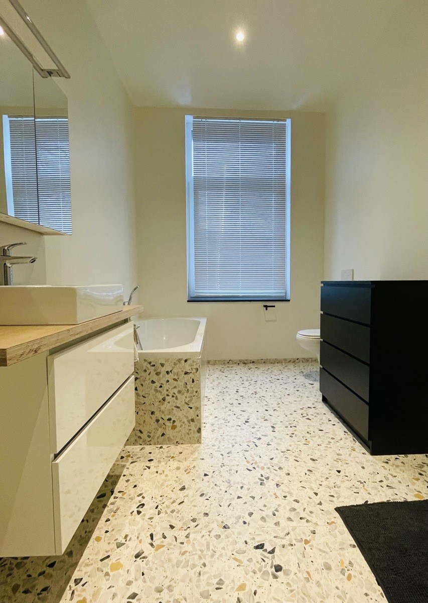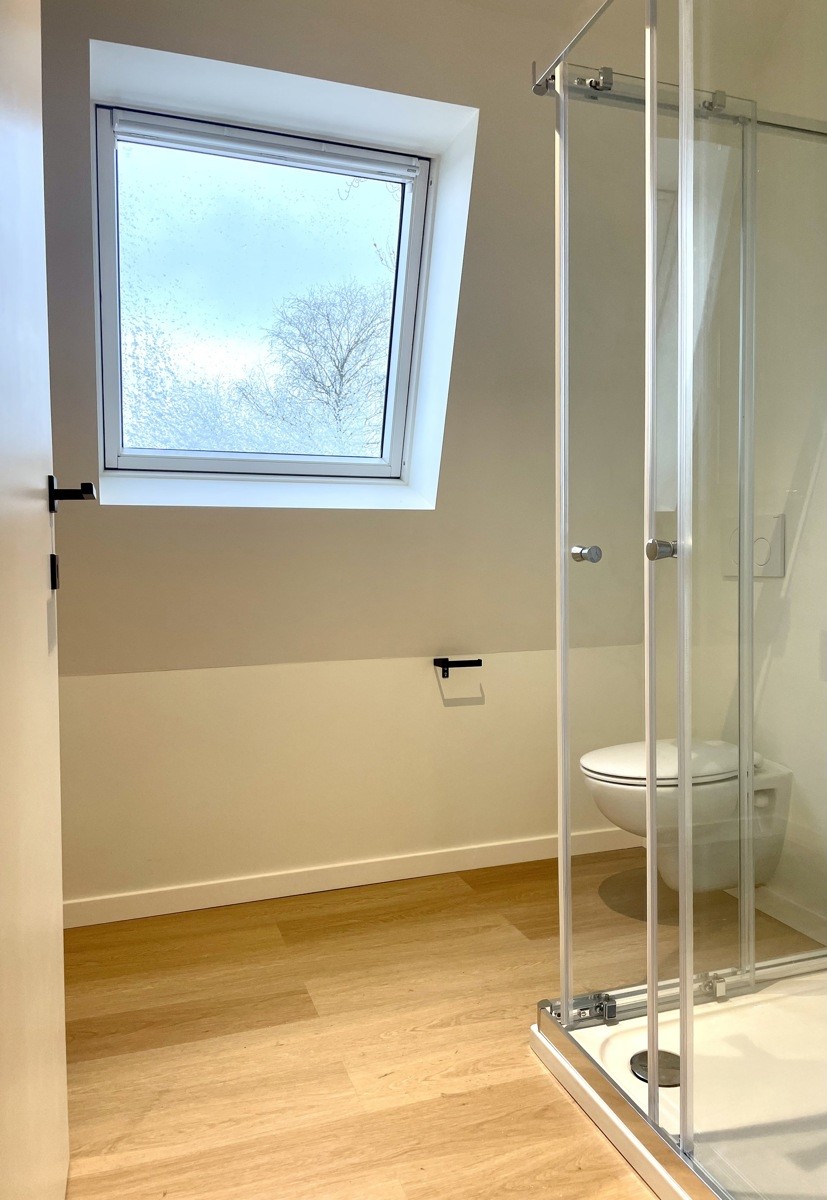 Op de eerste verdieping beschikt de woning over een slaapkamer en een ruime badkamer, uitgerust met een toilet, dubbele wastafel, ligbad en inloopdouche. Via een vaste trap bereikt men de zolderverdieping, waar zich een tweede, zeer ruime slaapkamer bevindt met een ensuite badkamer voorzien van douche, toilet en enkele wastafel.