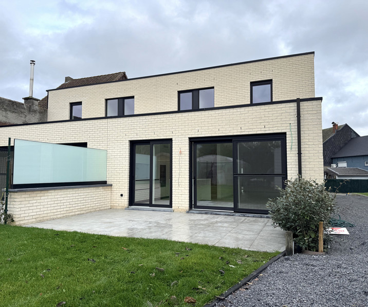 Deze recent gebouwde halfopen bebouwing biedt een combinatie van modern comfort, energiezuinigheid en een rustige ligging. De woning beschikt over een gedeelde externe garage waar plaats is voor één wagen en een ruime oprit die plaats biedt aan meerdere wagens. Achteraan bevindt zich een aangename tuin met een ruim terras, ideaal om in alle rust te ontspannen. Op het gelijkvloers omvat de woning een inkomhal met apart toilet, gevolgd door een zeer ruime en lichtrijke leefruimte die in twee delen is ingedeeld. De open, volledig geïnstalleerde keuken is uitgerust met alle moderne toestellen en sluit naadloos aan op de leefruimte. Aansluitend bevindt zich een grote berging met aansluiting voor wasmachine en droogkast en extra stockageruimte. Op de eerste verdieping zijn er drie volwaardige slaapkamers, een badkamer voorzien van douche, ligbad en dubbele lavabo, en een apart toilet op de nachthal. De woning is uitgerust met zonnepanelen (5000 Wp) en wordt verwarmd via een warmtepomp met vloerverwarming, wat zorgt voor een zeer energiezuinig wooncomfort. De huurprijs: 1400 EUR/maand, beschikbaar in onderling overleg.