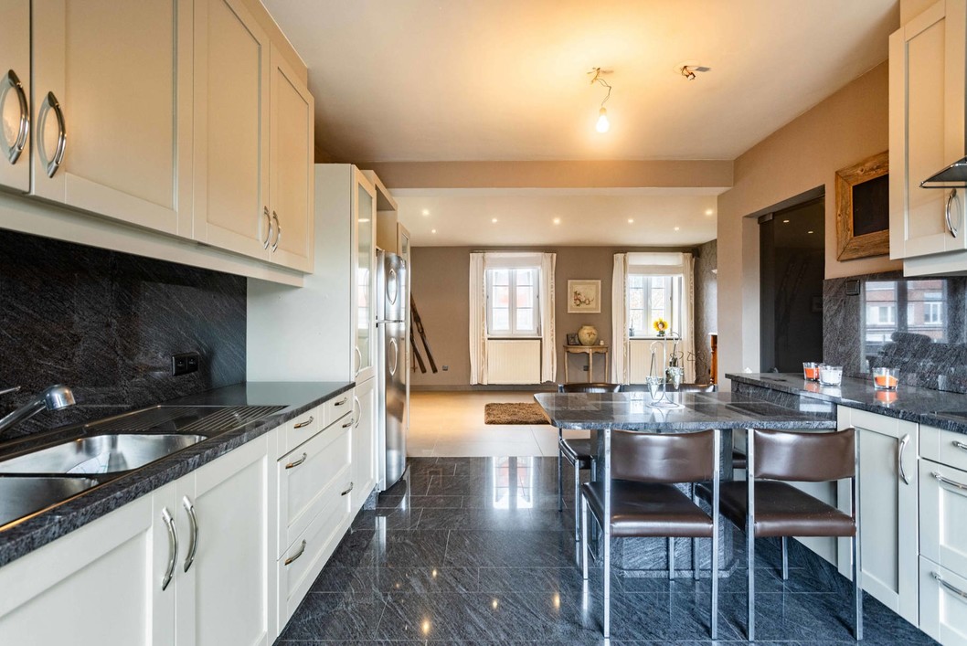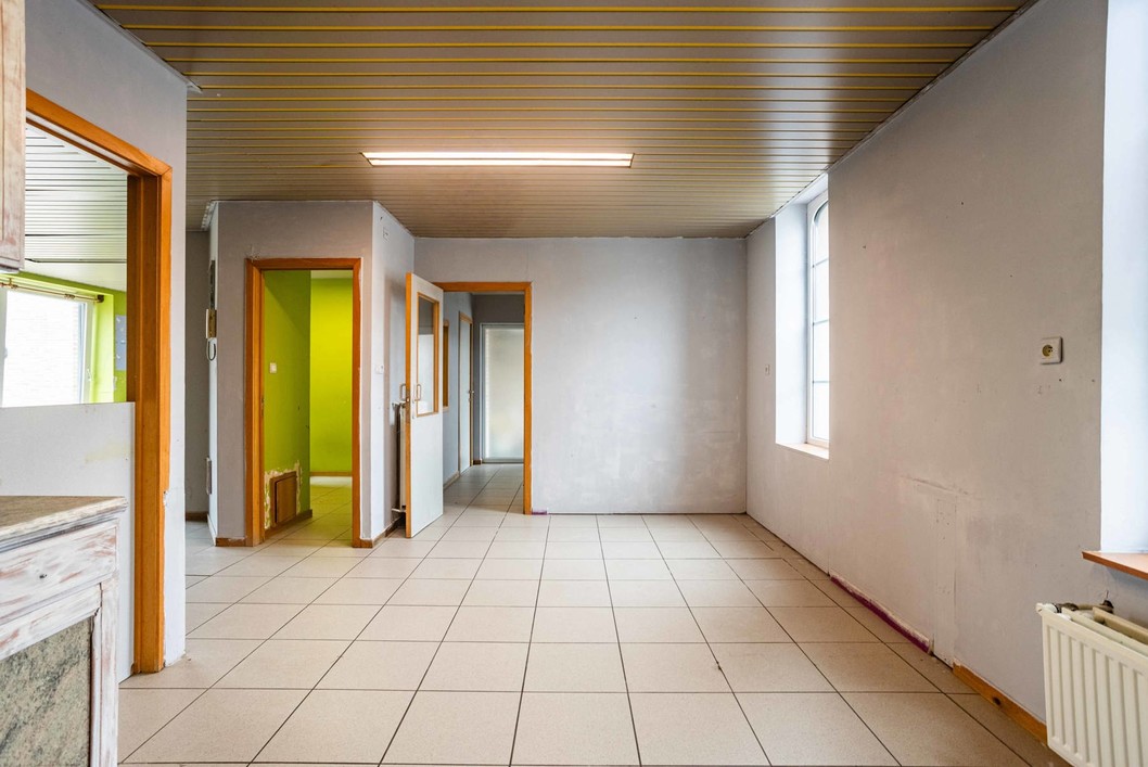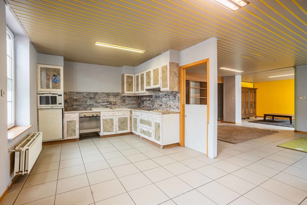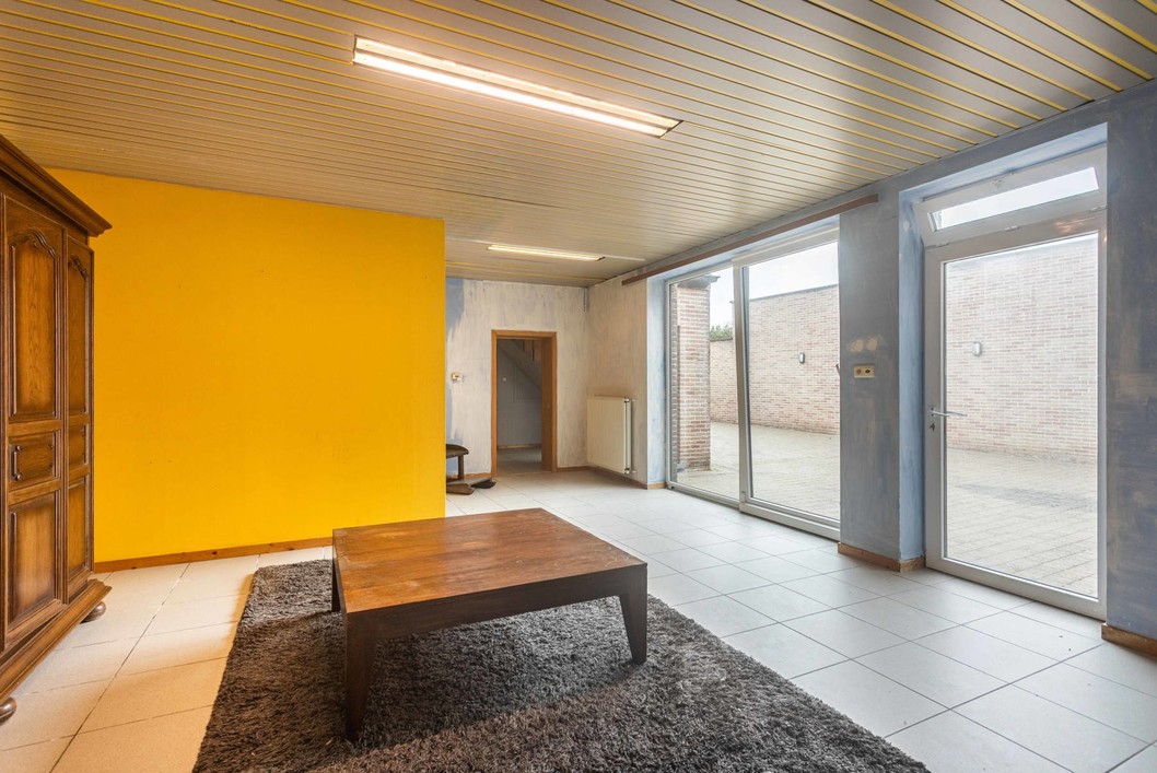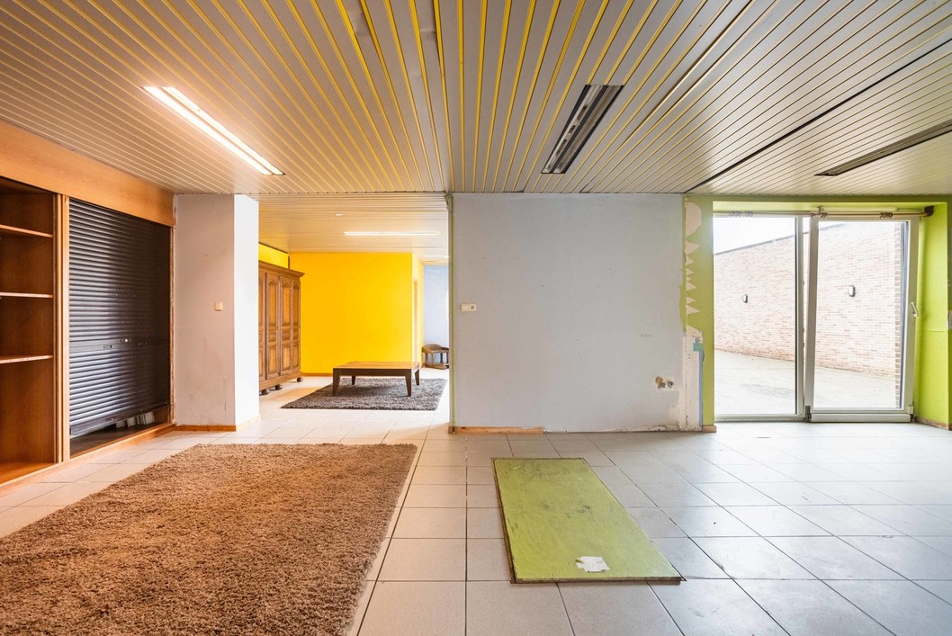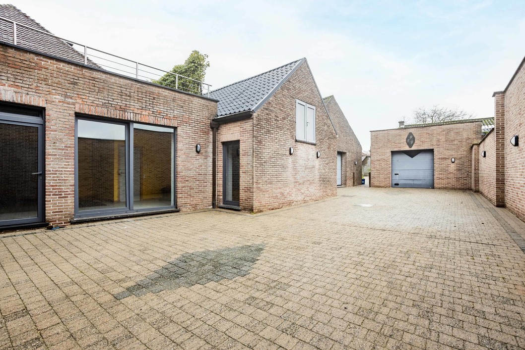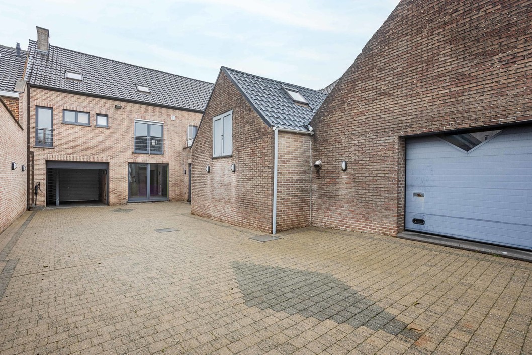 Boven de doorgang bevindt zich een duplex appartement van 205 m². Dit appartement omvat een inkomhal met apart toilet, een ruime leefruimte met eetplaats en open keuken, en toegang tot een aangenaam terras. Verder is er een slaapkamer, een badkamer met douche en toilet, en een praktische wasplaats. Op de bovenverdieping bevinden zich nog drie volwaardige slaapkamers en een zolderruimte. Op het gelijkvloers bevindt zich een voormalige kinderopvang met een royale oppervlakte van 191 m². De huidige indeling bestaat uit valse wanden, wat betekent dat deze ruimte volledig naar eigen wens kan worden heringericht. Dit maakt het perfect geschikt voor wie op zoek is naar een praktijkruimte, atelier, extra woonruimte of een tweede wooneenheid. Langs de zijkant van het gebouw is er een doorgang die leidt naar een ruime binnenplaats, een garage en een loods van maar liefst 170 m². Achter de loods bevindt zich een grote, zonnige tuin. Dankzij de combinatie van een grote polyvalente ruimte op het gelijkvloers, een afzonderlijk duplex appartement, een ruime loods en een diepe tuin, biedt deze eigendom een uitstekende kans om twee volwaardige woonentiteiten te creëren – ideaal voor co-housing, kangoeroewonen of een combinatie van wonen en werken.