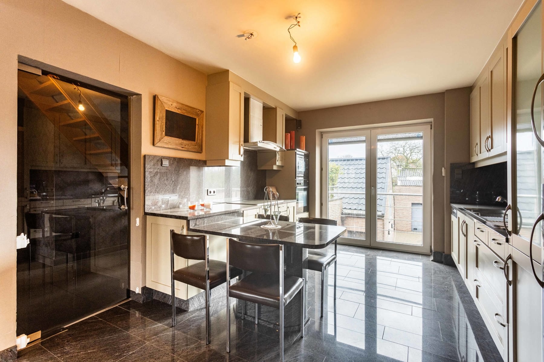 Boven de doorgang bevindt zich een duplex appartement van 205 m². Dit appartement omvat een inkomhal met apart toilet, een ruime leefruimte met eetplaats en open keuken, en toegang tot een aangenaam terras. Verder is er een slaapkamer, een badkamer met douche en toilet, en een praktische wasplaats. Op de bovenverdieping bevinden zich nog drie volwaardige slaapkamers en een zolderruimte. Op het gelijkvloers bevindt zich een voormalige kinderopvang met een royale oppervlakte van 191 m². De huidige indeling bestaat uit valse wanden, wat betekent dat deze ruimte volledig naar eigen wens kan worden heringericht. Dit maakt het perfect geschikt voor wie op zoek is naar een praktijkruimte, atelier, extra woonruimte of een tweede wooneenheid. Langs de zijkant van het gebouw is er een doorgang die leidt naar een ruime binnenplaats, een garage en een loods van maar liefst 170 m². Achter de loods bevindt zich een grote, zonnige tuin. Dankzij de combinatie van een grote polyvalente ruimte op het gelijkvloers, een afzonderlijk duplex appartement, een ruime loods en een diepe tuin, biedt deze eigendom een uitstekende kans om twee volwaardige woonentiteiten te creëren – ideaal voor co-housing, kangoeroewonen of een combinatie van wonen en werken.