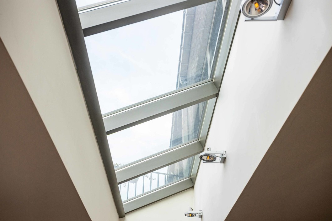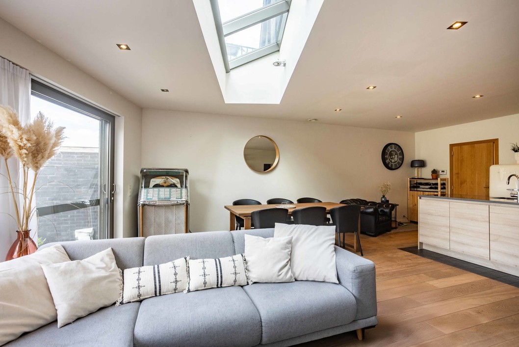 Op het gelijkvloers bevindt zich een inkomhal met gastentoilet en directe toegang tot de inpandige garage. De lichtrijke leefruimte met grote raampartijen sluit naadloos aan op de volledig uitgeruste open keuken, voorzien van alle moderne toestellen zoals vaatwasmachine, dubbele spoelbak, dampkap, kookplaat, koelkast, oven en microgolfoven. Dankzij de grote glaspartijen en lichtkoepel geniet u hier van een overvloed aan natuurlijk licht en een aangename woonervaring.